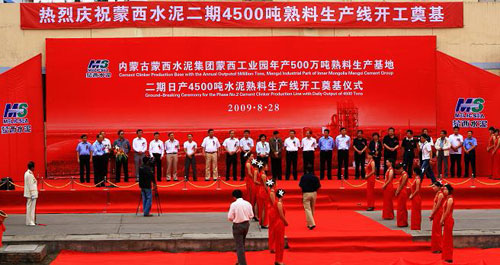 奠 基儀式由蒙西水泥集團執行董事兼副總裁賈恒昌主持。蒙西水泥集團總裁葉向東、蒙西集團公司總裁孫建國、鄂托克旗旗長尚志強、鄂爾多斯市政協副主席劉桂花先 后致辭。鄂爾多斯市市政府副秘書長楊殿明,鄂托克旗委書記郝健君、人大主任華·格日樂巴圖、政協主席李月珍等市旗領導;中國銀行內蒙古分行代表、烏海分行 行長張楠,神華集團烏海能源公司董事長李來喜,內蒙古隆升建安公司董事長郭全生,神華蒙西煤化公司董事長姜英利等金融和企業單位負責人;蒙西集團公司副總 裁包雙江、蒙西水泥集團副總裁兼生產經營中心主任張耀華、蒙西水泥集團財務總監張字勇等參加奠基儀式。自治區、鄂爾多斯市、鄂托克旗、蒙西工業園各有關單 位、內蒙古中實成套設備公司、內蒙古建材科研設計院、北方聯合電力蒙西發電廠、項目監理單位、設備廠家、重點用戶和格蘭系部分企業領導到場祝賀。